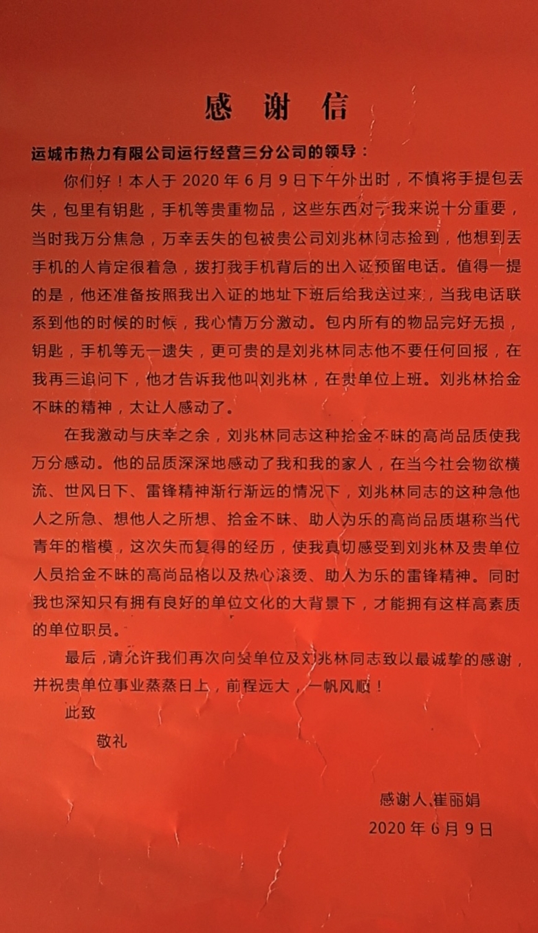 劉兆林同志拾金不昧,急失主所急,用自己的實際行動踐行了運城熱力人的精神風(fēng)貌,用良好的個人形象樹立了熱力人傳遞社會正能量的好榜樣,發(fā)揚了中華民族的傳統(tǒng)美德,傳承了社會文明新風(fēng)尚。