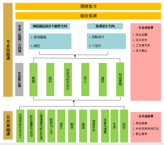 根據(jù)《教育部關(guān)于職業(yè)院校專業(yè)人才培養(yǎng)方案制訂與實施工作的指導(dǎo)意見》(教職成〔2019〕13號)關(guān)于規(guī)范課程設(shè)置的要求,圍繞工藝美術(shù)專業(yè)人才培養(yǎng)目標(biāo),以學(xué)生為主體,結(jié)合專業(yè)實際,融合職業(yè)要求,行業(yè)崗位需求,職業(yè)資格標(biāo)準(zhǔn),實現(xiàn)課程內(nèi)容和職業(yè)標(biāo)準(zhǔn)對接、教學(xué)過程與工作過程對接,校企共同完善和深化課程體系。對學(xué)生的職業(yè)素養(yǎng)、專業(yè)知識、專業(yè)技能、綜合項目實訓(xùn)等進行全方位培養(yǎng),保證人才培養(yǎng)質(zhì)量,培養(yǎng)高素質(zhì)的專業(yè)技術(shù)技能人才。