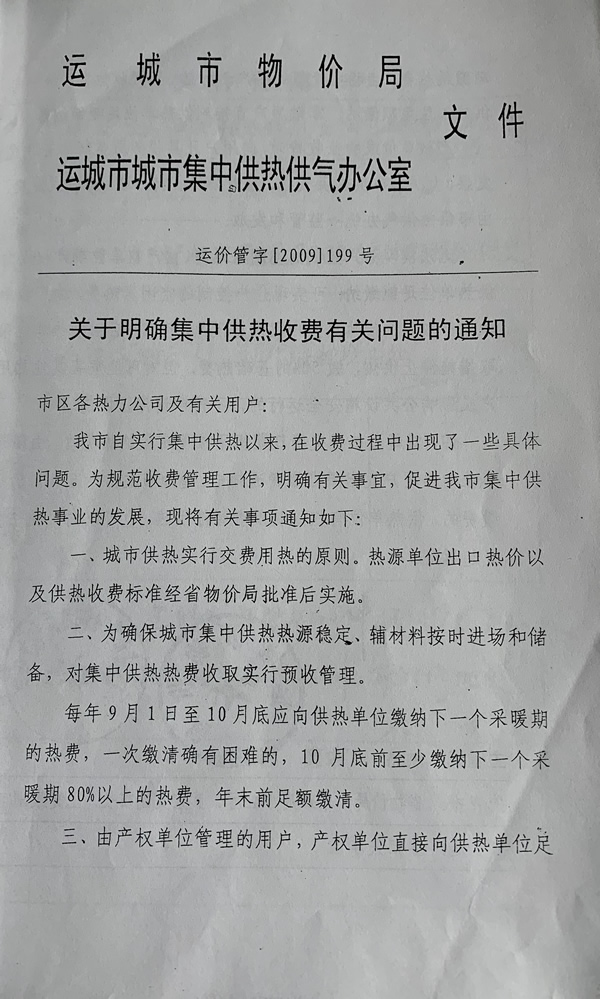 關(guān)于運城市城區(qū)熱電聯(lián)產(chǎn)集中供熱(試行)價格的通知