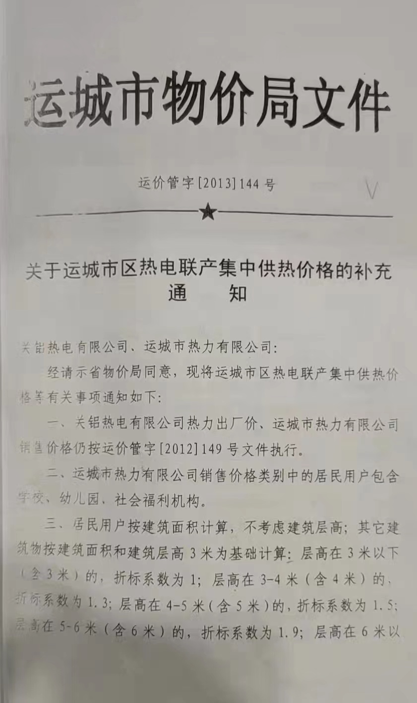 關(guān)于運(yùn)城市區(qū)熱電聯(lián)產(chǎn)集中供熱價(jià)格的補(bǔ)充通知